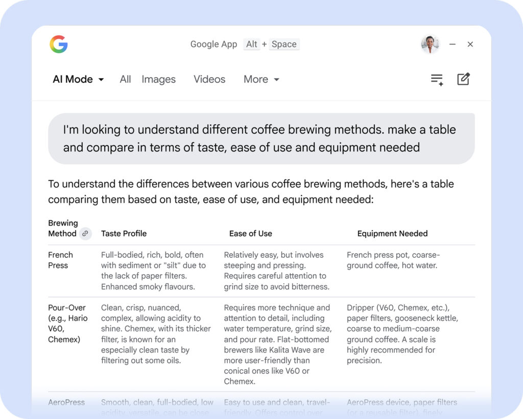 이번 앱의 핵심은 맥의 스포트라이트처럼 단축키 하나로 검색창을 바로 띄울 수 있다는 점입니다. 사용자는 Alt와 스페이스 키를 눌러 검색창을 열고 웹 검색은 물론 PC에 저장된 파일 설치된 앱 구글 드라이브 파일까지 한 번에 찾을 수 있습니다. 검색 결과는 플로팅 창 안에서 이어서 확인할 수 있고 이미지나 AI 모드 같은 탭으로도 바로 이동할 수 있습니다.