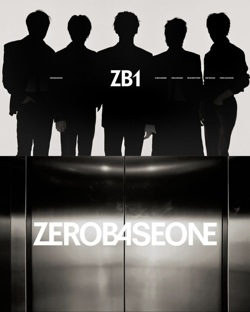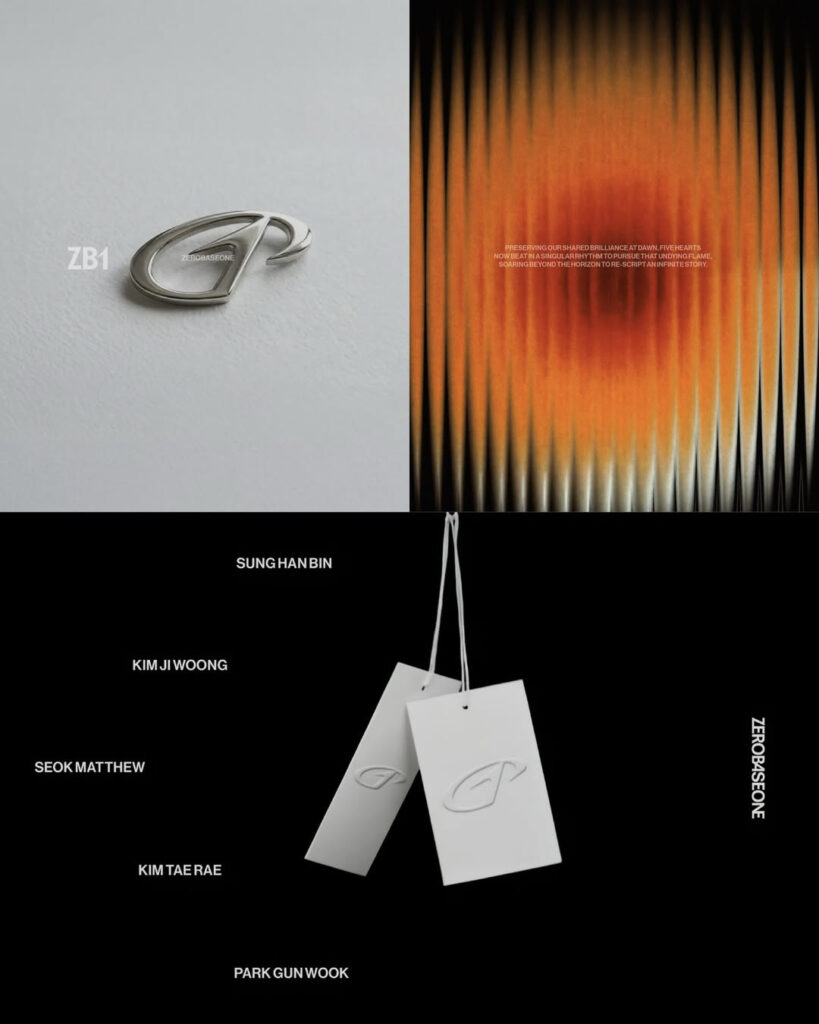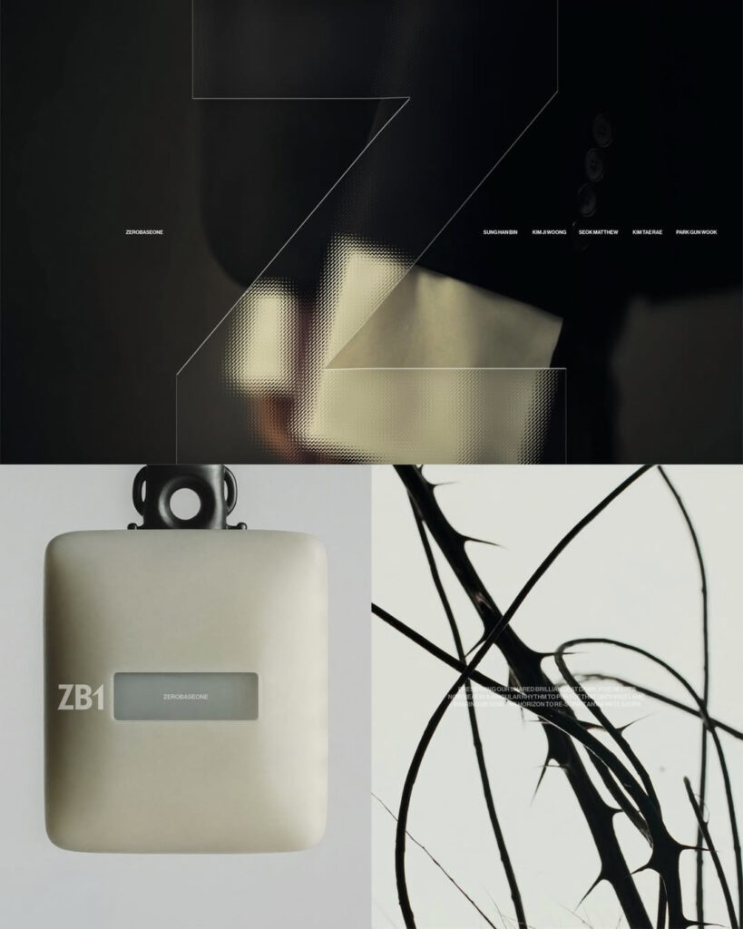 제로베이스원의 브랜디 디자인입니다.새 아이덴티티는 심볼과 합자 기반의 풀 로고 그리고 두 요소를 결합한 컴팩트 로고로 구성됩니다.
