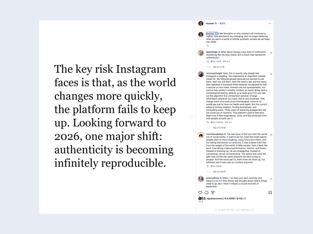 인스타그램 최고경영자 아담 모세리가 인공지능 생성 콘텐츠가 일상이 된 미래를 바라보며 플랫폼이 직면한 핵심 과제를 공개적으로 언급했습니다. 그는 최근 스레드에 올린 글에서 인공지능으로 만들어진 이미지와 실제 촬영된 콘텐츠를 구분하는 일이 점점 더 어려워지고 있다고 밝혔습니다. 모세리는 소셜미디어 플랫폼들이 인공지능 생성 콘텐츠를 식별하고 표시해야 한다는 압박을 받을 것이라고 설명했습니다. 초기에는 주요 플랫폼들이 비교적 잘 대응할 수 […]