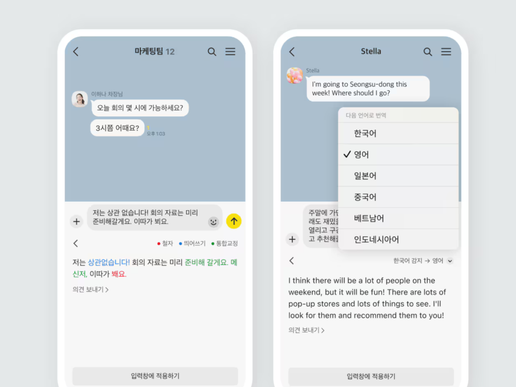 카카오톡에 맞춤법 교정과 19개 언어 번역 기능이 추가됐습니다. 맞춤법 교정 기능은 메시지를 입력한 후 ‘맞춤법’ 아이콘을 클릭하면 철자와 띄어쓰기 등의 오류를 자동으로 수정해 줍니다. 수정된 내용을 미리보기로 확인한 후 ‘입력창에 적용하기’ 버튼을 누르면 교정된 메시지를 바로 전송할 수 있습니다. 번역 기능은 메시지 입력 후 ‘번역’ 아이콘을 통해 영어, 중국어, 일본어, 스페인어 등 19개 언어로 내용을 […]