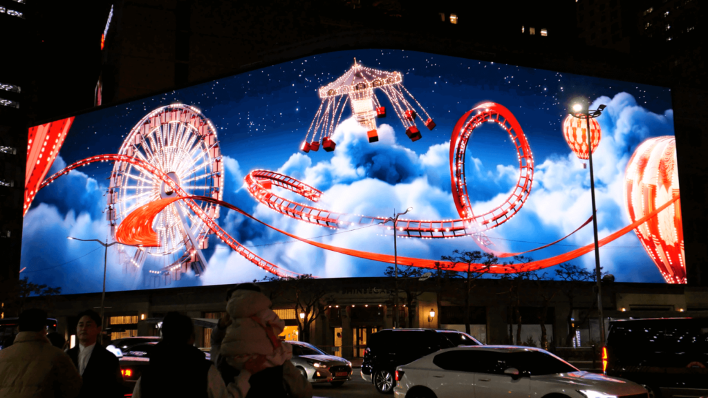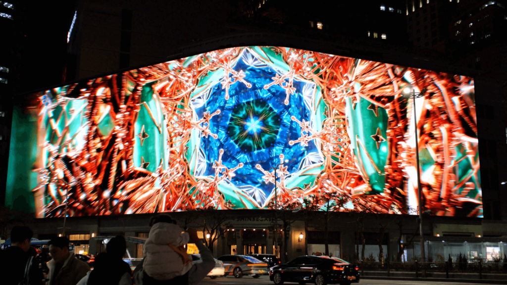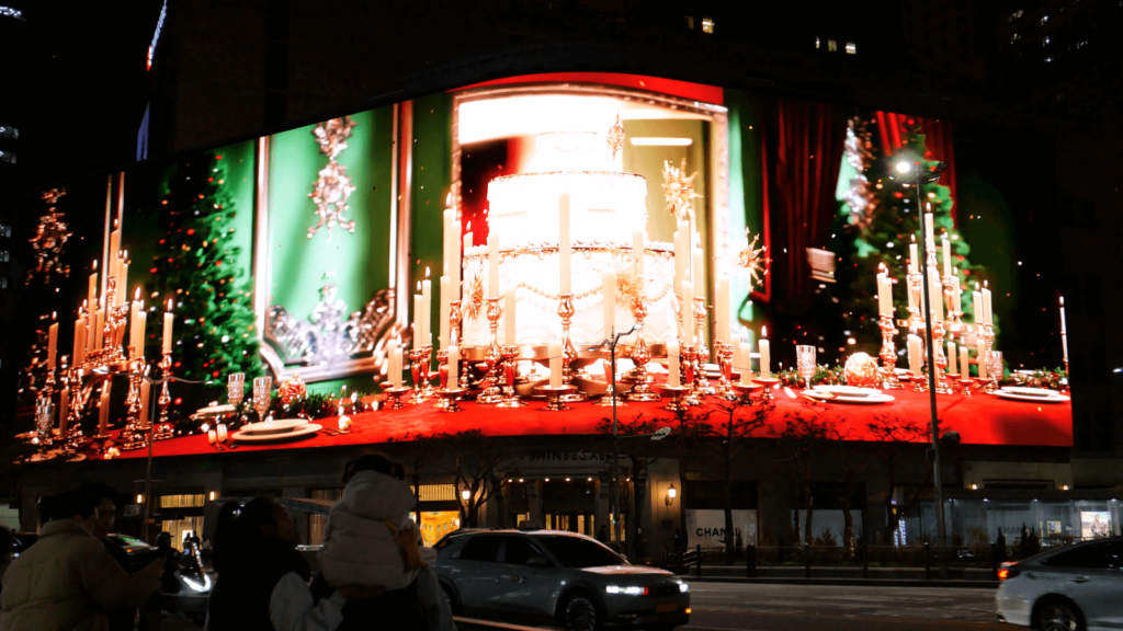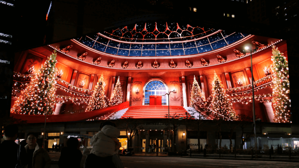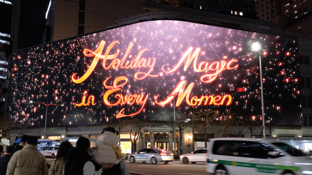 신세계가 평년보다 이른 11월 1일부터 연말 연시 시즌을 기념한 미디어 파사드를 선보였습니다. 농구장 3개 크기의 초대형 8K 스크린에 ‘크리스마스의 순간들을 찾아서(Pursuit of Chrismas Moments)’라는 주제로 몰입감 있는 영상을 담았습니다. 영상의 마지막엔 그동안의 여정을 이끌던 대형 리본이 ‘마법 같은 연말이 매 순간 함께하길(Holiday Magic in Every Moment)’이라는 문구를 더해 연말의 설렘을 더합니다.