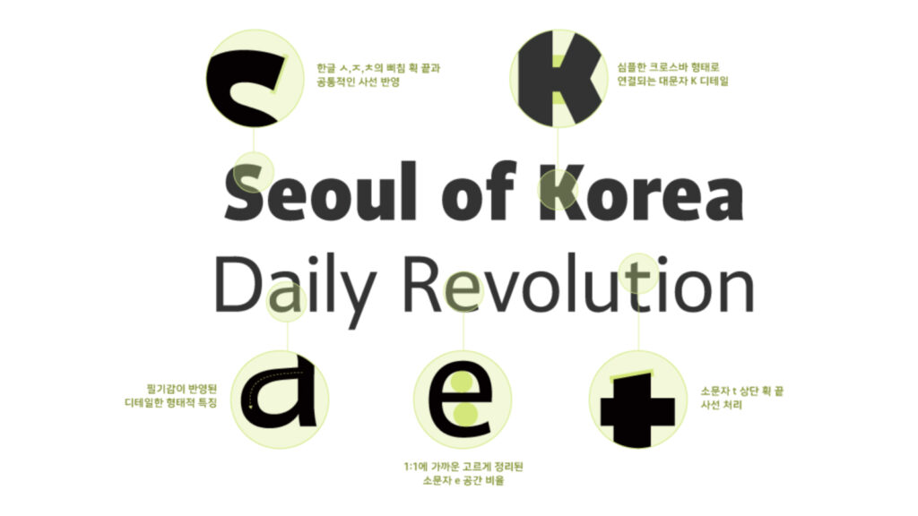 This is the font that Seoul City will apply in April 2025 when it completely reorganizes its subway map for the first time in 40 years since the opening of Line 1 in 1974. It maintains a stable letter form with the same width and square structure, and provides an easy-to-read composition with no unnecessary characters. It also expresses modern humanism through natural handwriting shapes and delicate curved strokes. It supports rapid information delivery by forming clear identification and positive images through fan-shaped caps and curved horizontal strokes.