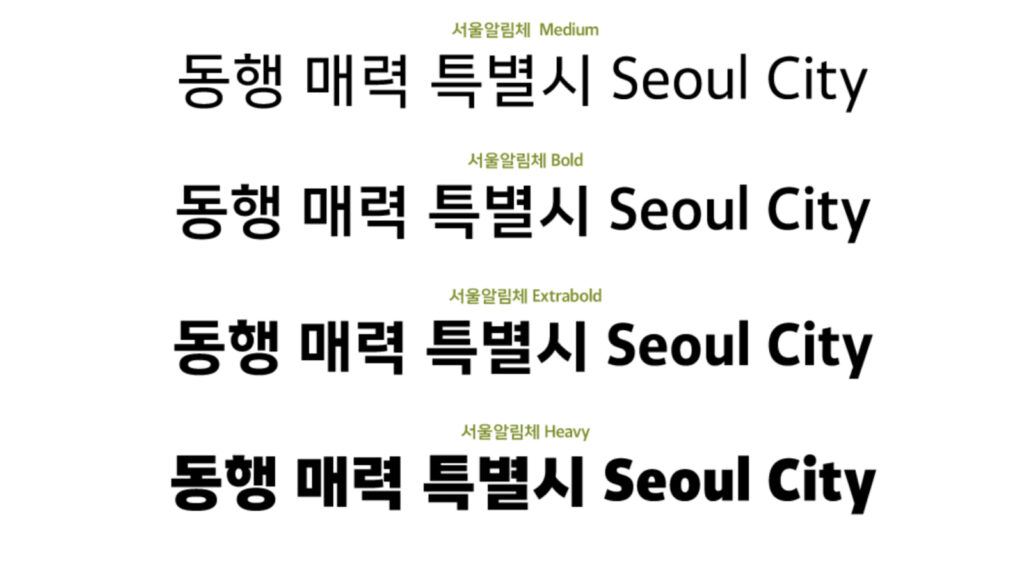 Seoul Notification Font consists of 4 types (Medium, Bold, Extra Bold, Heavy) and anyone can download and use it for free. However, selling, transferring for a fee, or unauthorized distribution is not permitted.