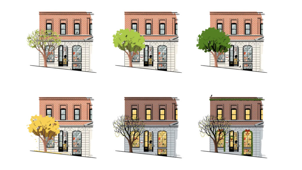The online UX has also been redesigned. The seasonal store illustrations by Japanese illustrator Satoshi Hashimoto open and close depending on the time of day, and the iconic ginkgo tree and Eames House bird seamlessly connect the online and offline experiences. Clicking on the Easter egg-shaped bird also takes you to the Eames Lab.