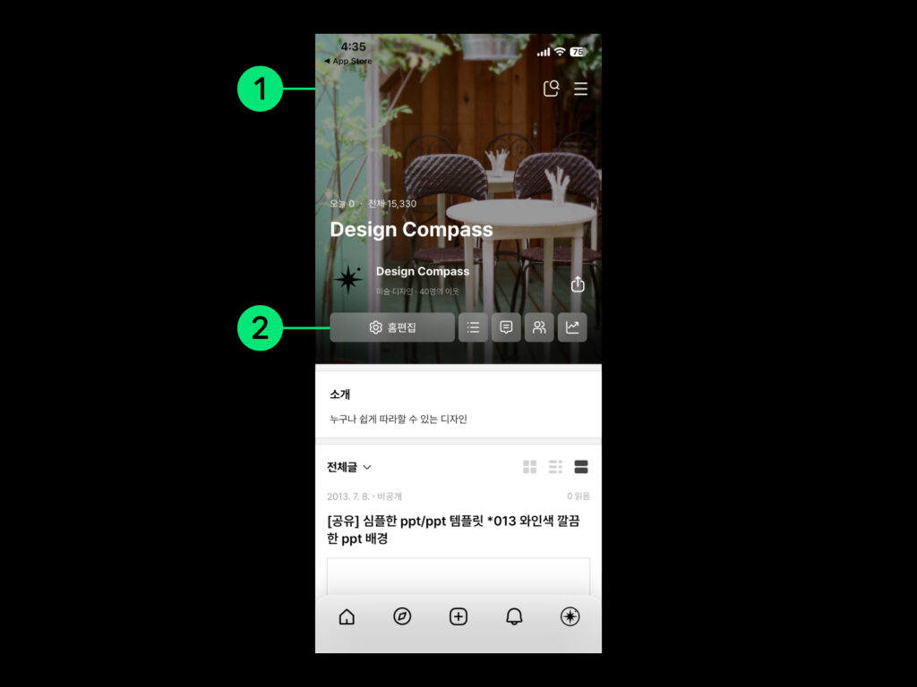 Tapping your profile image in the bottom navigation of the app will take you to the My Blog screen. This blog screen allows you to directly edit your blog as it currently appears, allowing you to adjust content composition and layout in real time.