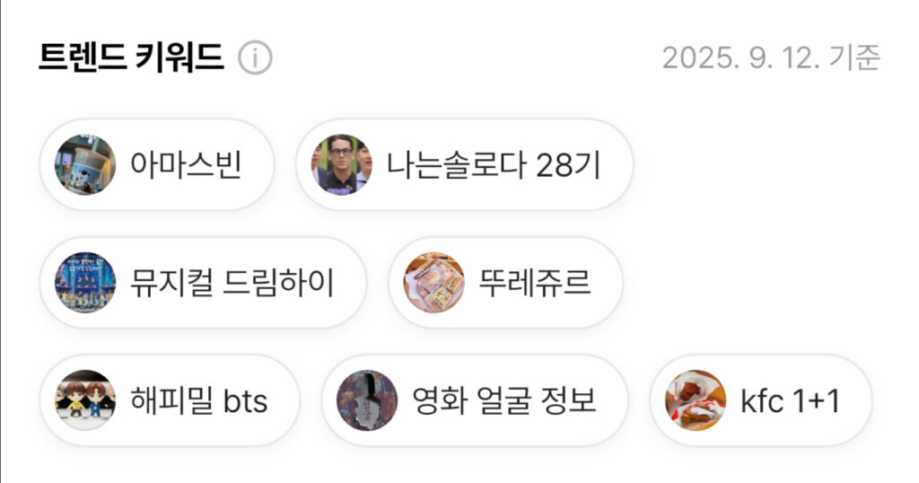 ‘"Trend Keywords" are recommended based on keywords that were popular within the blog over a specific period. They are designed to maximize the number of keywords of varying lengths displayed on a single screen in a chip format. Additionally, each keyword is accompanied by an image for easy visual identification.
