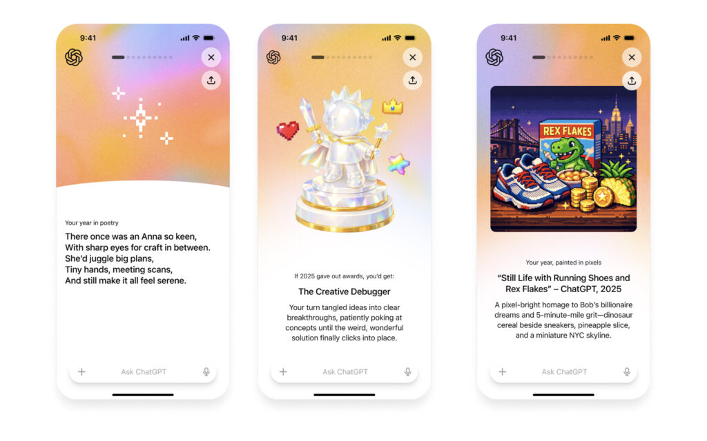 ChatGPT also generates poetry and pixel-style images based on the user's interests. Its design is designed to stimulate the desire to share by providing personalized visual content representative of 2025. OpenAI explains that this feature is designed to be lightweight, privacy-focused, and user-controlled.
