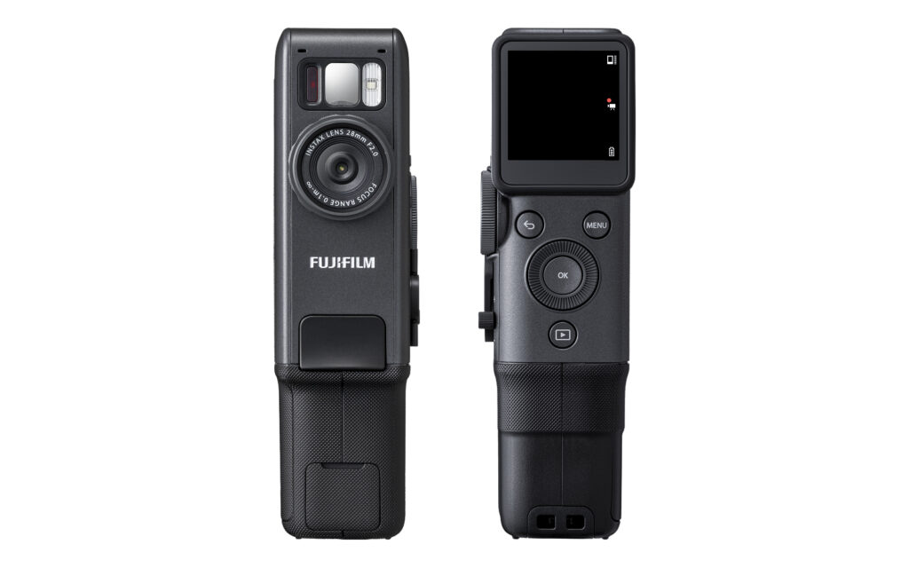 The exterior features a vertical grip design inspired by the Fujica Single 8, released in 1965. The analog operating experience is emphasized, with features like the click of a dial and a print lever reminiscent of film winding. A viewfinder attachment accessory and grip attachment are also included.