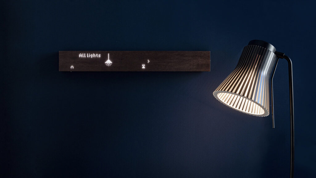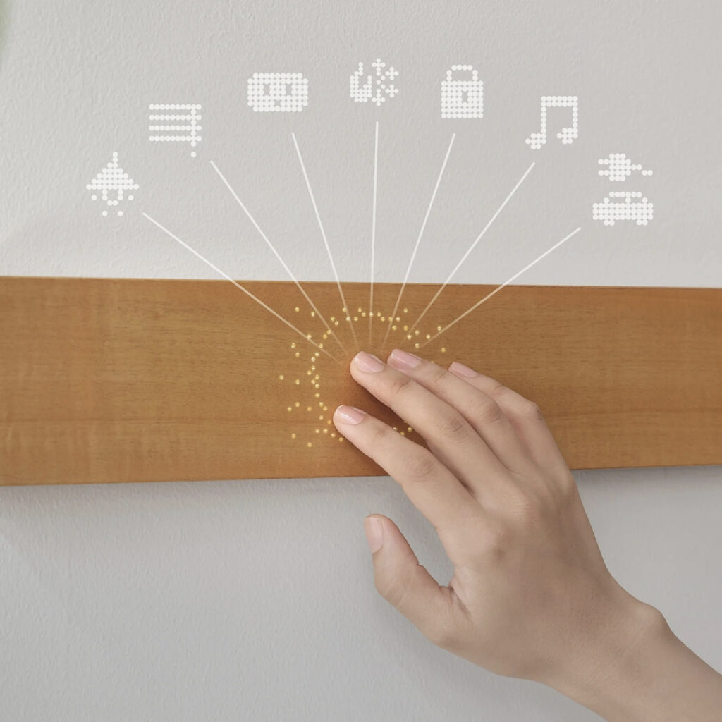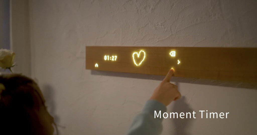 The second-generation Mui Board is a touch display panel made of natural wood. It remains powered off when not in use, visually resembling a piece of furniture rather than a digital device. Information is revealed through soft light only when touched or gestured. Designed to avoid dominating the space, technology is displayed only when needed.
