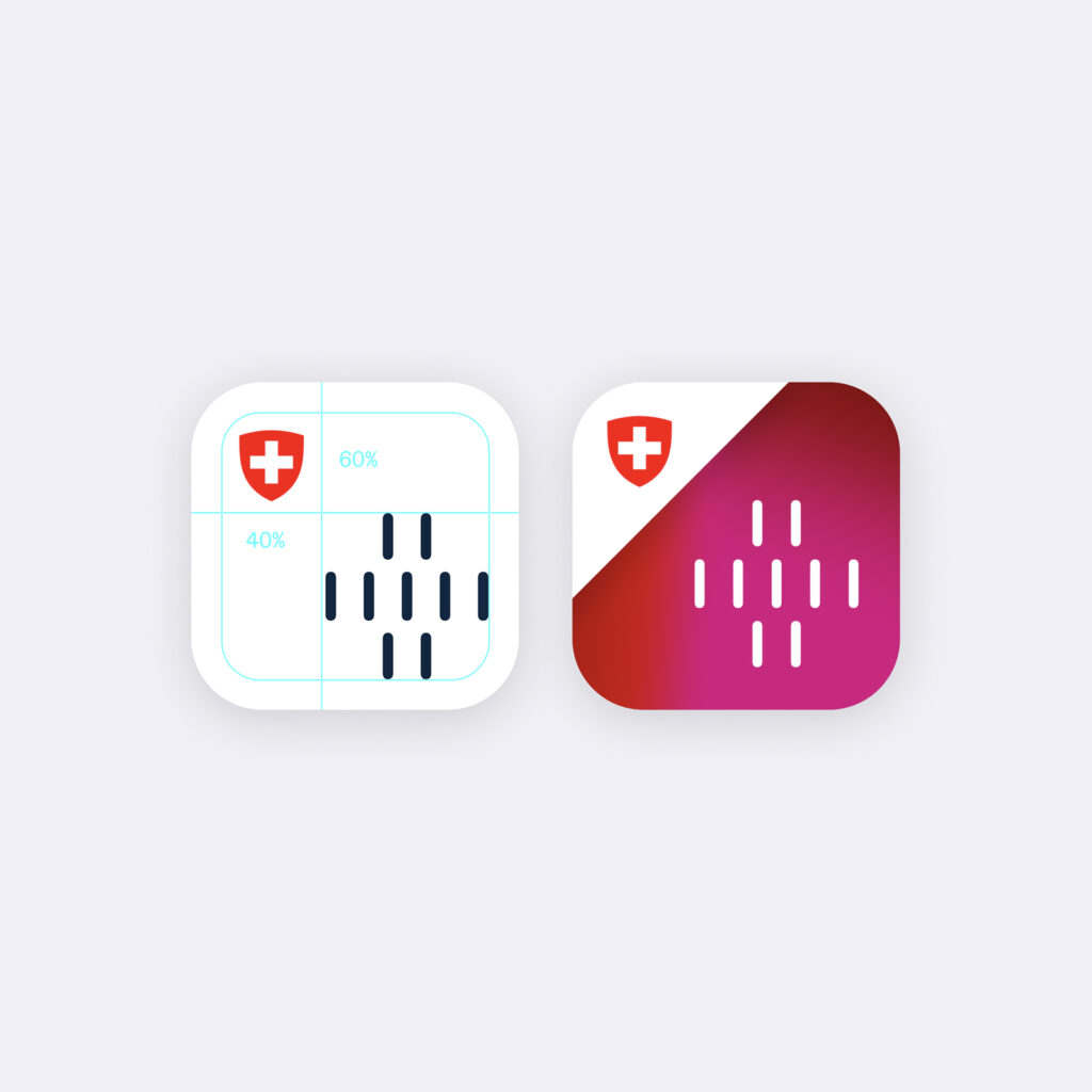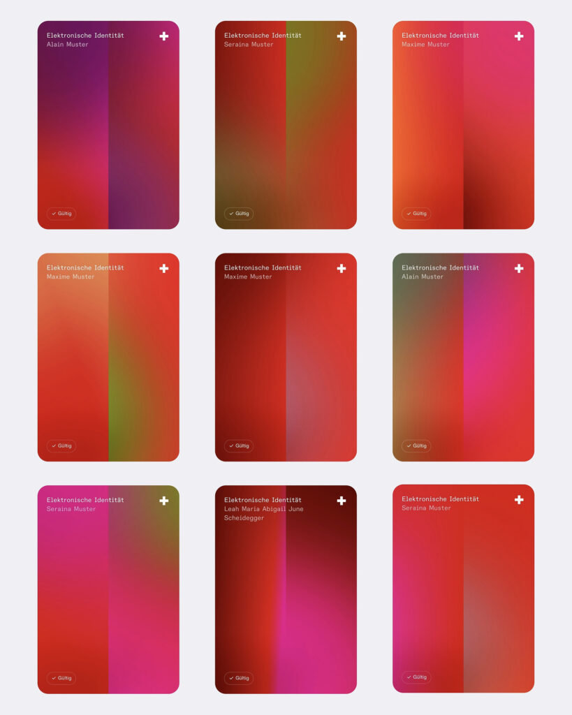 The color strategy focused on visualizing Switzerland's diversity. Two dynamic gradient layers were used to create countless combinations and reinforce the impression that each user has their own unique eID. In the app, the gradient moves with each touch on the eID area or tilt of the phone, intuitively conveying security and authenticity.