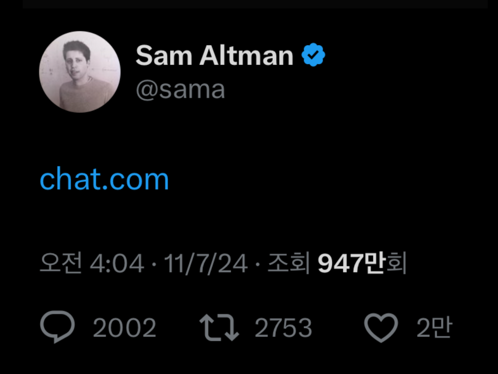 오픈 AI가 Chat.com도메인을 샀습니다. 이제 Chat.com을 치면 ChatGPT로 이동합니다. 샘 올트먼은 X에 chat.com이라는 URL만을 올렸습니다. 오픈AI는 작년에 상징적인 도메인 ai.com을 1,100달러에 구매하기도 했습니다. Chat.com은 1996년 9월에 등록된 지 오래된 도메인 중 하나입니다. HubSpot의 공동 창립자이자 CTO인 다르메시 샤(Dharmesh Shah)가 1,000만 달러에 개인적으로 인수했었습니다. 샤는 작년 3월 익명의 매수자에게 매각했다고 밝혔는데 그 사람은 바로 오픈AI였습니다. 샤는 […]