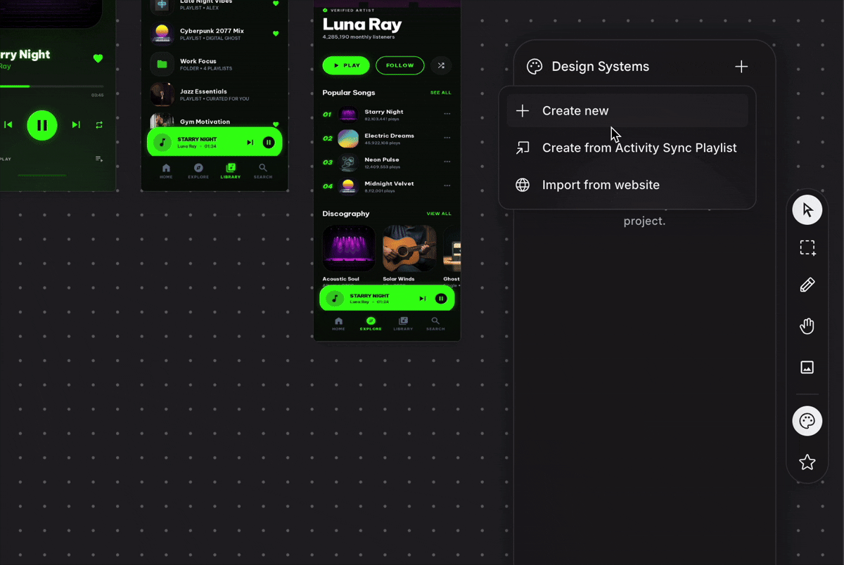 이미 만들어진 UI에서 디자인 시스템을 생성한다. 사용자가 직접 시각 요소를 세밀하게 설정하지 않아도 디자인 시스템을 만들고 라이트 모드, 다크 모드를 설정할 수 있다.